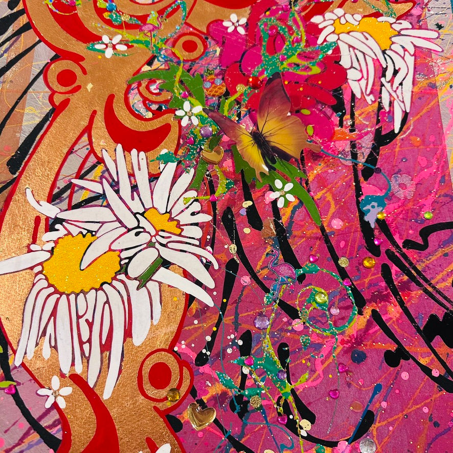 Unique Work on Paper in mixed media incl: printed image, gloss paint, gold leaf, glitter, stickers, sequins and sparkling Swarovski crystals